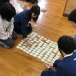 1月13日に、小学校生活最後の百人一首大会を実施しました。100首すべてを使い、13グループに分かれて対戦しました。下の句が詠まれる前に札に手を伸ばしたり、自分の得意な札に狙いを定めたりするなど、懸命に札を取り合い熱戦を繰り広げました。